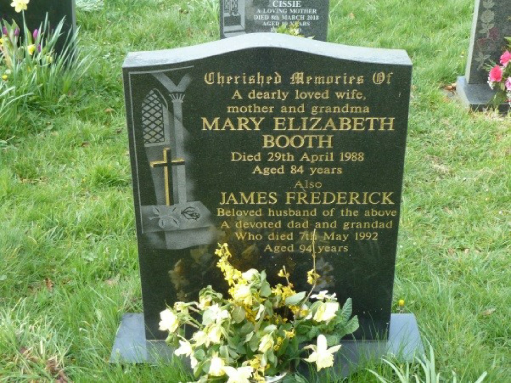 CHERISHED MEMORIES OF A DEARLY LOVED WIFE MOTHER AND GRANDMA MARY ELIZABETH BOOTH DIED 29 APRIL 1988 AGED 84 YEARS ALSO JAMES FREDERICK BELOVED HUSBAND OF THE ABOVE A DEVOTED DAD AND GRANDAD WHO DIED 7 MAY 1992 AGED 94 YEARS [Of 5 New Cotts. Foxt] |
