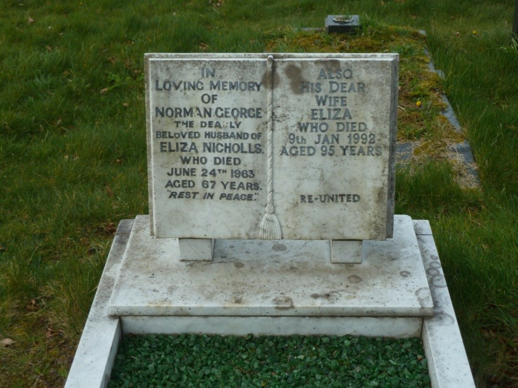 IN LOVING MEMORY OF NORMAN GEORGE THE DEARLY BELOVED HUSBAND OF ELIZA NICHOLLS WHO DIED JUNE 24 1963 AGED 67 YEARS REST IN PEACE ALSO HIS DEAR WIFE ELIZA WHO DIED JAN 1992 AGED 95 YEARS RE - UNITED [Norman Of 11 New Cotts., Foxt] [Eliza of Well St., Cheadle] |