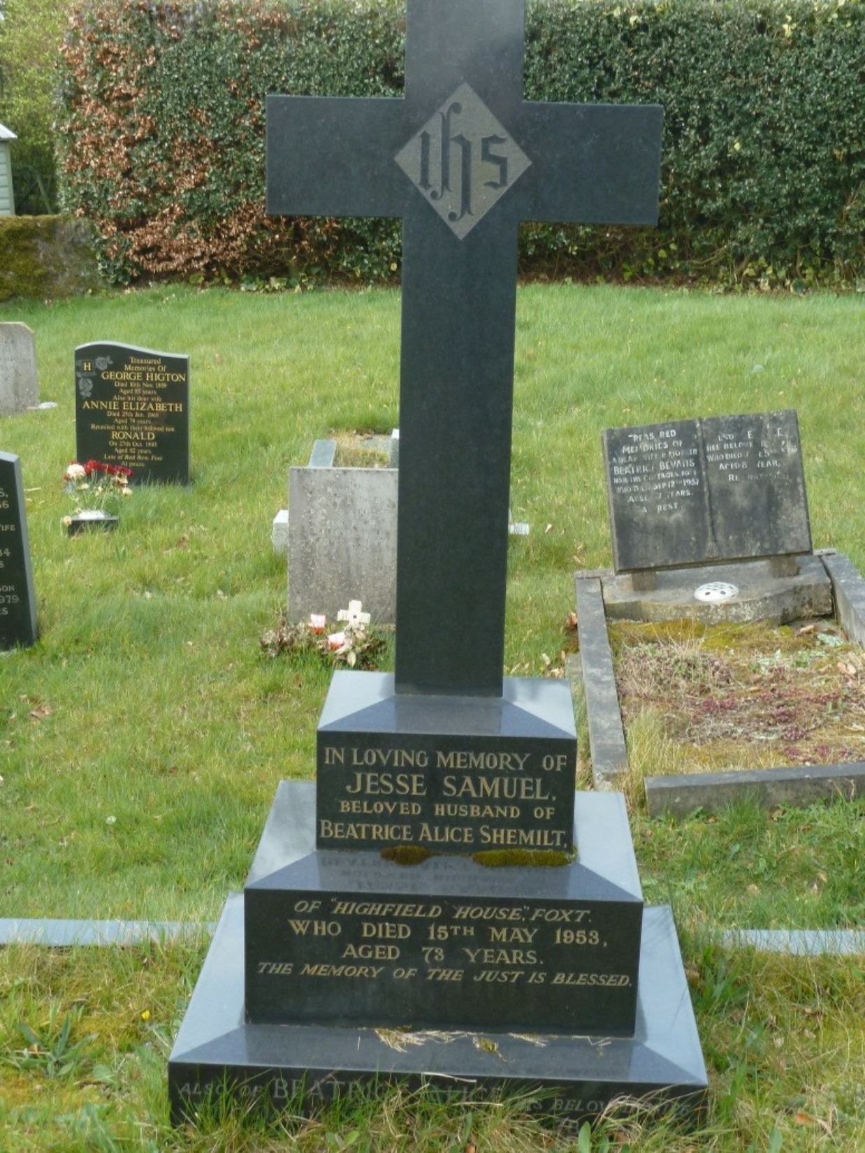 IN LOVING MEMORY OF JESSE SAMUEL BELOVED HUSBAND OF BEATRICE ALICE SHEMILT OF HIGHFIELD HOUSE FOXT WHO DIED 15 MAY 1953 AGED 73 YEARS THE MEMORY OF' THE JUST IS BLESSED ALSO OF BEATRICE ALICE HIS BELOVED WIFE DIED JANUARY 6 1963 AGED 78 YEARS “JESUS IN THY MERCY “ REST IN PEACE |