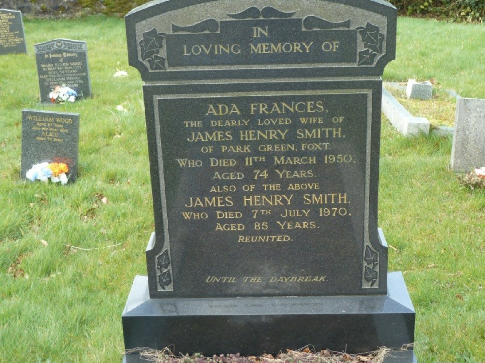 IN LOVING MEMORY OF ADA FRANCES THE DEARLY LOVED WIFE OF JAMES HENRY SMITH OF PARK GREEN FOXT WHO DIED 11 MARCH 1950 AGED 74 YEARS ALSO OF THE ABOVE JAMES HENRY SMITH WHO DIED 7 JULY 1970 AGED 85 YEARS REUNITED UNTIL THE DAYBREAK |