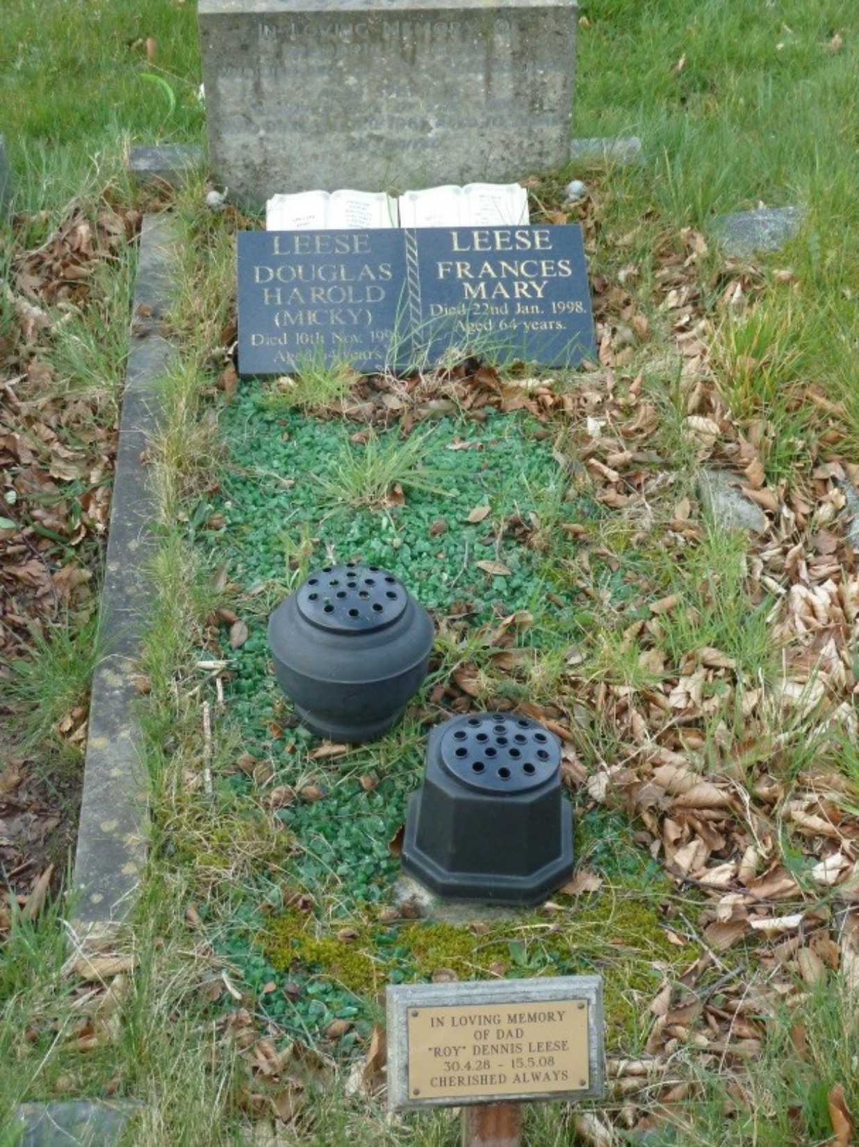 IN LOVING MEMORY OF FREDERICK LEESE WHO DIED JUNE 29 1942 AGED 53 YEARS ALSO NELLIE BELOVED WIFE OF THE ABOVE WHO DIED JAN 12 1961 AGED 70 YEARS REUNITED Book like TABLET LEESE LEESE DOUGLAS FRANCES HAROLD MARY (MICKY) DIED 22 JAN 1998 DIED 10 NOV 1993 AGED 64 YEARS AGED 64 YEARS Small brass plate. In Loving memory Of Dad “Roy” Dennis Leese 30.4.28 – 15.5.08 Cherished Always IN LOVING MEMORY OF MY DEAR HUSBAND FREDERICK JOHN WILSON OF THE VILLAS FOXT WHO DIED 9 APRIL 1945 AGED 77 YEARS ALSO HIS WIFE SELINA DIED MAY 1 1958 AGED 84 YEARS |