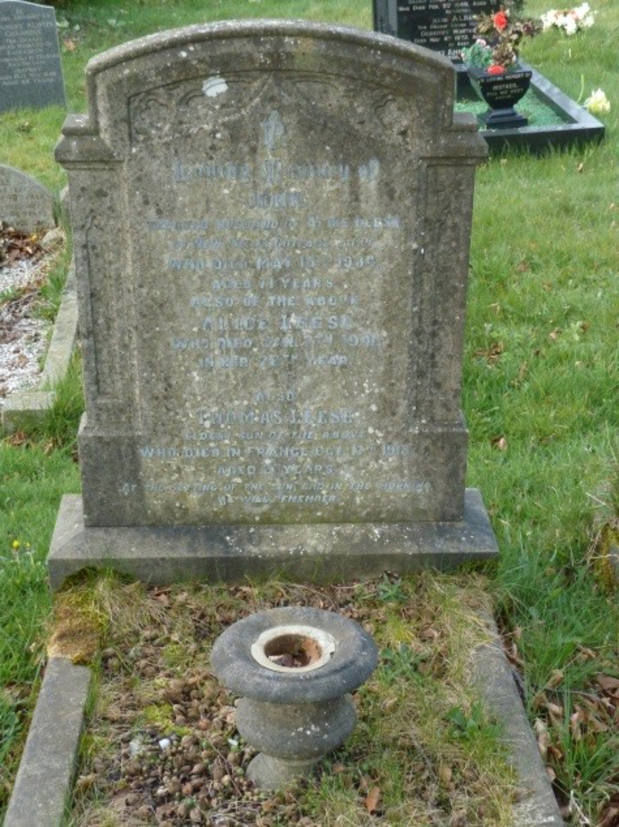 IN LOVING MEMORY OF JOHN BELOVED HUSBAND OF ALICE LEESE OF NEW FIELDS COTTAGE FOXT WHO DIED MAY 15 1934 AGED 71 YEARS ALSO OF THE ABOVE ALICE LEESE WHO DIED JAN 7 1941 IN HER 78 YEAR ALSO THOMAS LEESE ELDEST SON OF THE ABOVE WHO DIED IN FRANCE OCT 17 1918 AGED 31 YEARS AT THE SETTING OF THE SUN AND IN THE MORNING WE WILL REMEMBER Also Ashes.of Leese, John April 19th 1969 age 65 Of Bath / Foxt |