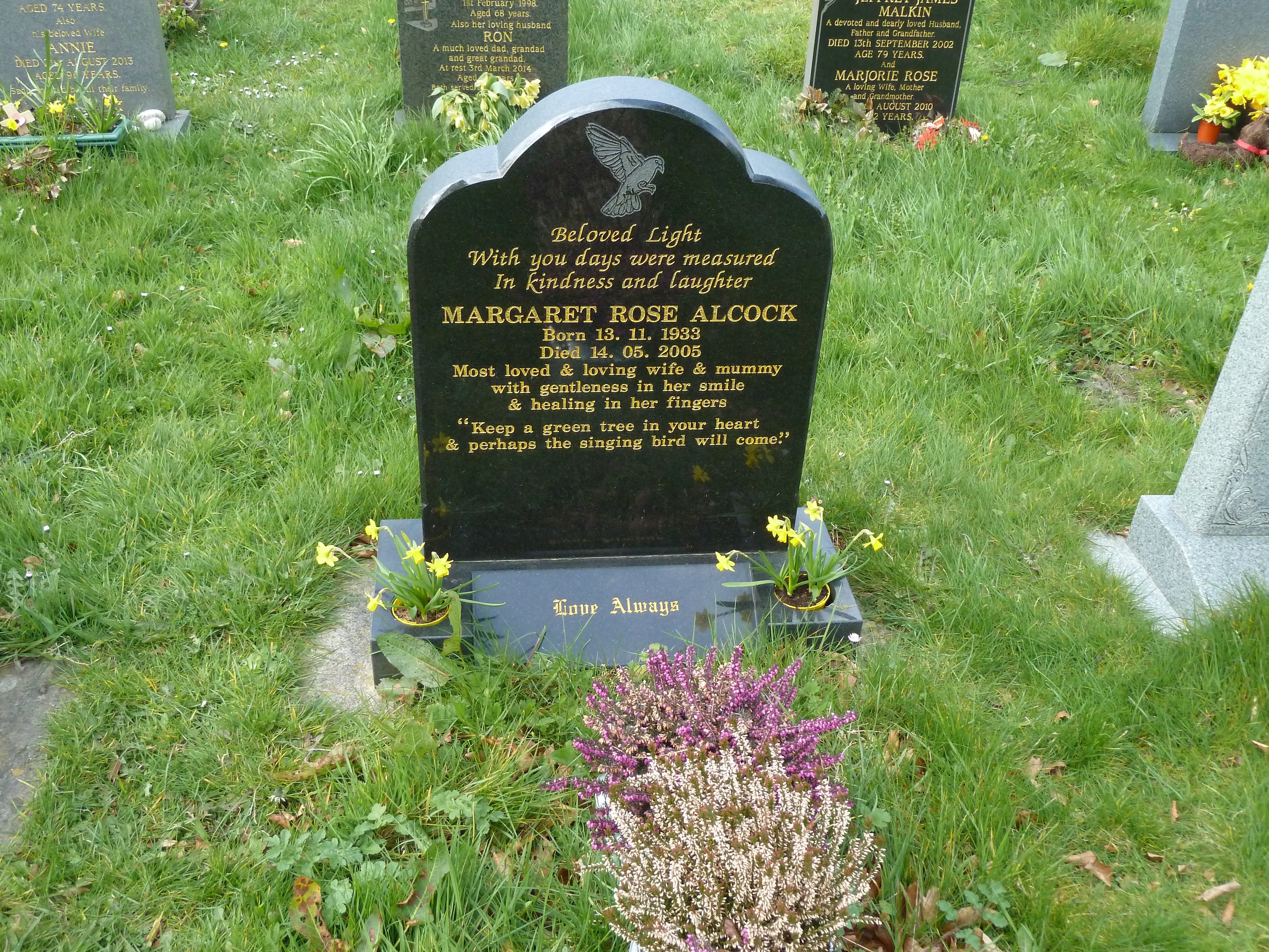 Beloved Light With you days were measured In kindness and laughter MARGARET ROSE ALCOCK Born 13.11.1933 Died 14.05. 2005 Most loved and loving wife & mummy with gentleness in her smile & healing in her fingers “Keep a green tree in your heart & perhaps the singing bird will come” Love Always |