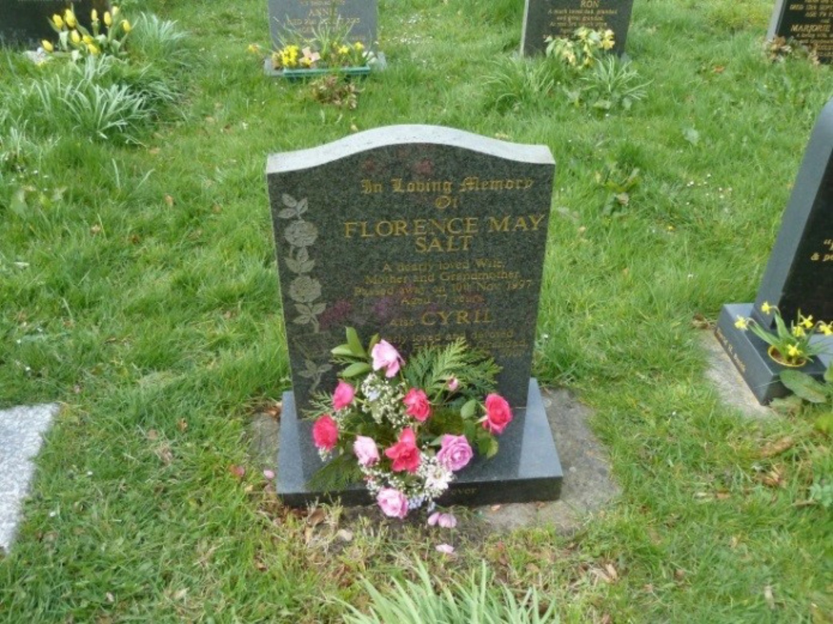 IN LOVING MEMORY OF FLORENCE MAY SALT A DEARLY LOVED WIFE MOTHER AND GRANDMOTHER PASSED AWAY ON 10 NOV 1997 AGED 77 YEARS ALSO CYRIL DEARLY LOVED AND DEVOTED HUSBAND FATHER AND GRANDFATHER PASSED AWAY 24 JULY 2001 AGED 79 YEARS TOGETHER FOREVER [Of 3 The Villas, Foxt] |
