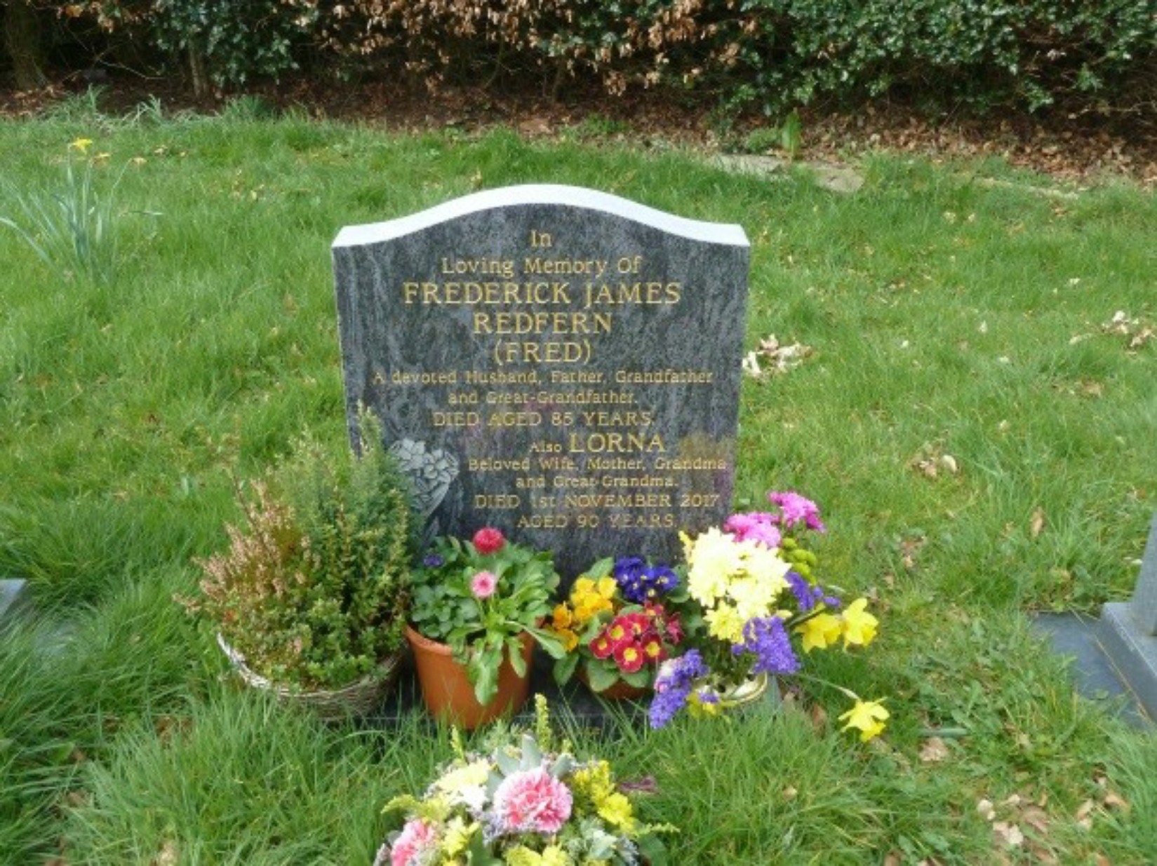 In Loving Memory of FREDERICK JAMES REDFERN (FRED) A devoted Husband, Father Grandfather & Great Grandfather DIED AGED 85 years ALSO LORNA Beloved wife Mother Grandma & Great Grandma DIED 1st NOVEMBER 2017 AGED 90 YEARS [Of Foxt Wood Farm, Foxt.] |