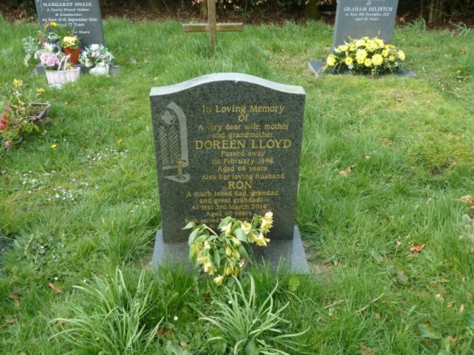 IN LOVING MEMORY OF A VERY DEAR WIFE MOTHER AND GRANDMOTHER DOREEN LLOYD PASSED AWAY Ist FEBRUARY 1998 AGED 68 YEARS Also her Loving husband RON A much loved Dad grandad And great grandad At Rest 3 March 2014 Aged 90 years [of 4 Mount Pleasant, Foxt] |