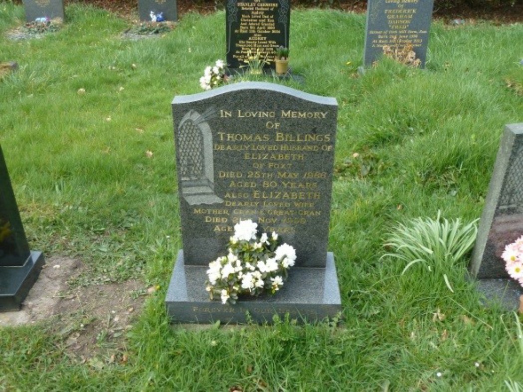 IN LOVING MEMORY OF THOMAS BILLINGS [of 6 New Cotts., Foxt] DEARLY LOVED HUSBAND OF ELIZABETH OF FOXT DIED 25 MAY 1986 AGED 80 YEARS ALSO ELIZABETH [Of 13 New Cotts. Foxt] DEARLY LOVED WIFE MOTHER GRANNIE GREAT GRAN DIED 21 NOV 1999 AGED 89 YEARS FOREVER IN OUR HEARTS |