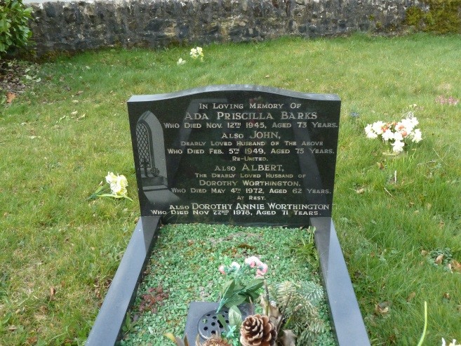 IN LOVING MEMORY OF ADA PRISCILLA BARKS WHO DIED NOV 12 1945 AGED 73 YEARS ALSO JOHN DEARLY LOVED HUSBAND OF THE ABOVE WHO DIED FEB 5 1949 AGED 75 YEARS RE - UNITED[Of Red Row, Foxt] ALSO ALBERT THE DEARLY LOVED HUSBAND OF DOROTHY WORTHINGTON WHO DIED MAY 13 1972 AGED 62 YEARS ALSO DOROIHY ANNIE WORTHINGTON WHO DIED NOV 22 1978 AGED 71 YEARS [Of 51 Brookfield Rd., Ipstones] (URN) IN LOVING MEMORY OF MOTHER TILL WE MEET AGAIN FROM HARRIET RONALD CHRISTINE & STANLEY |