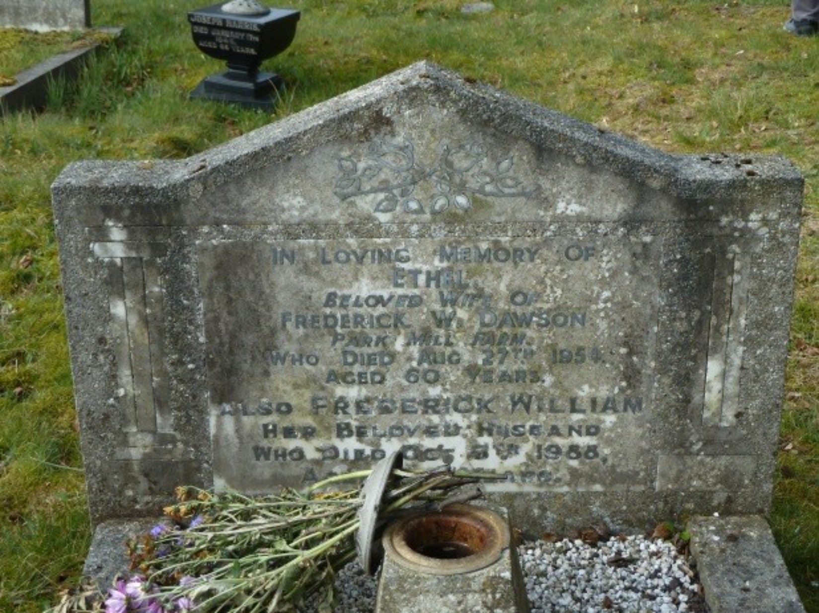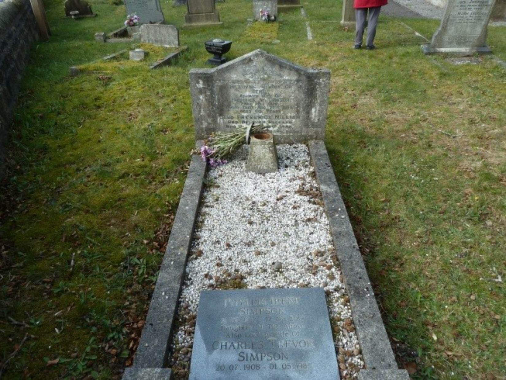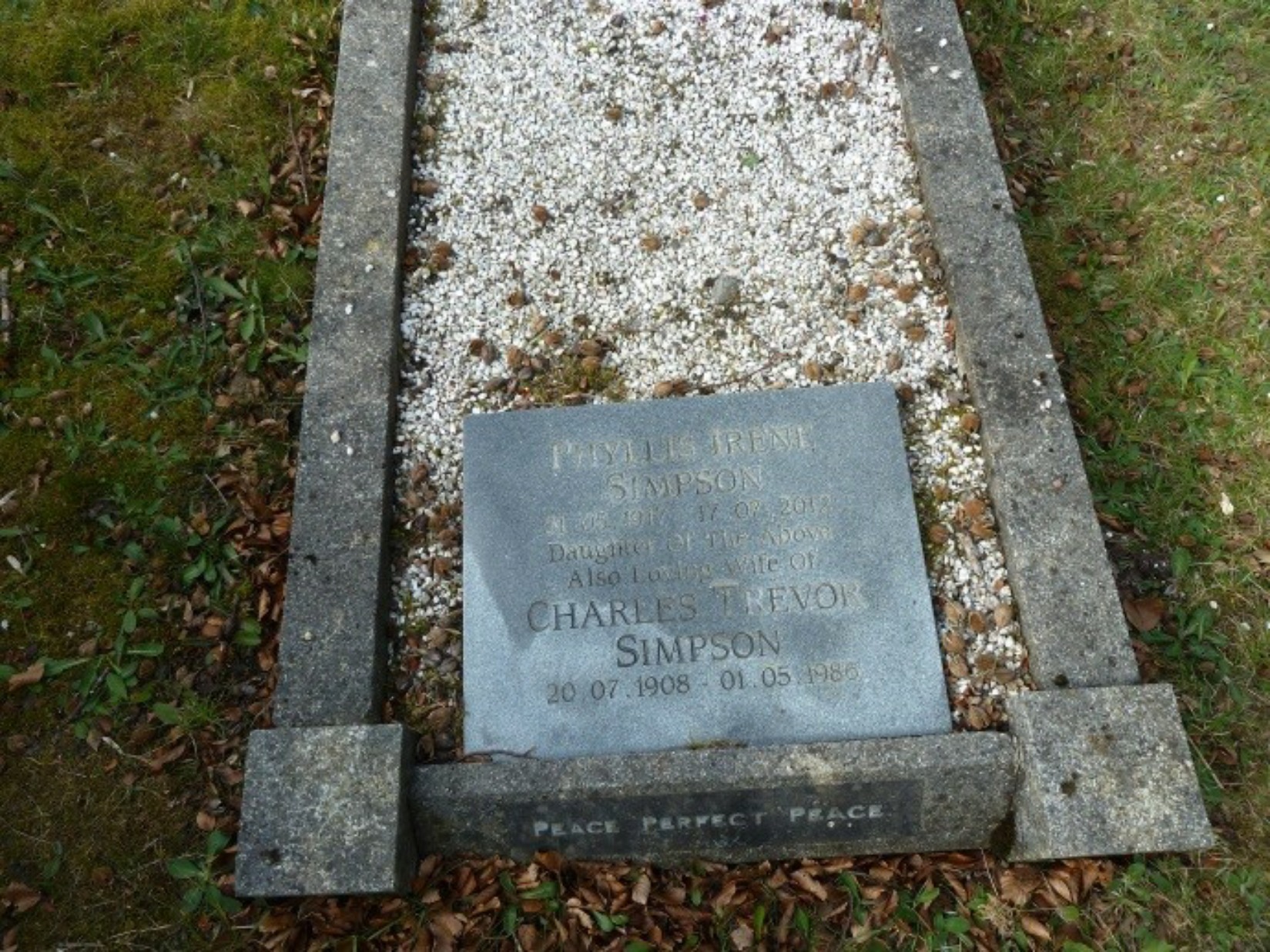 IN LOVING MEMORY OF ETHEL BELOVED WIFE OF FREDERICK W DAWSON PEACE PERFECT PEACE Plaque on Dawson Grave.[see Left] PHYLIS TRENT SIMPSON 31.05.1917 17.07.2012 Daughter of the Above. Also Loving wife of CHARLES TREVOR SIMPSON 20.07.1908 10.05.1986 |