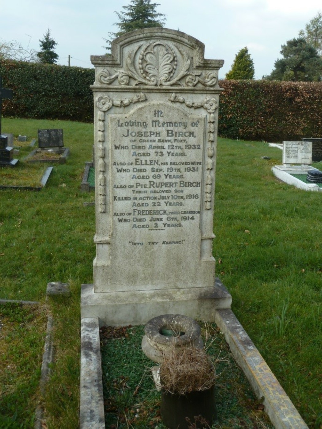 Loving Memory of JOSEPH BIRCH Of Green Bank Foxt. WHO DIED APRIL 12 1932 AGED 73 YEARS ALSO OF ELLEN HIS BELOVED WIFE WHO DIED SEP 19 1931 AGED 69 YEARS ALSO OF PTE RUPERT BIRCH THEIR BELOVED SON KILLED IN ACTION JULY 10 1916 AGED 22 ALSO FREDERICK THEIR GRANDSON WHO DIED JUNE 6 1914 AGED 2 YEARS On the Kerb. INTO THY KEEPING TREASURED MEMORIES OF A DEARLY LOVED HUSBAND AND FATHER ROBERT ROBERTSON DIED FEB 10 1975 AGED 69 YEARS HANNAH ROBERTSON THE DEARLY LOVED WIFE OF ROBERT ROBERTSON AND DAUGHTER OF JOSEPH AND ELLEN BIRCH WHO DIED 27 AUGUST 1982 AGED 83 YEARS |
